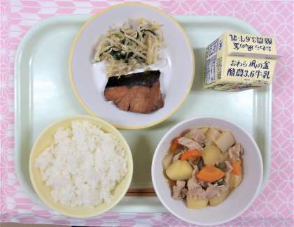 【献立】 ・ごはん ・牛乳 ・ふくらぎの照り焼き ・甘酢和え ・豚肉とじゃがいものうま煮