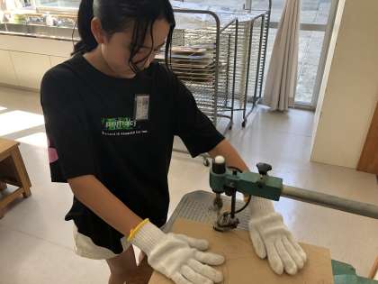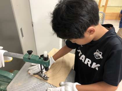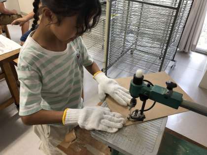 図画工作科では、伝言板づくりに取り組んでいます。電動糸のこぎりを使って、自分がデザインした板の形に丁寧に切り進めました。