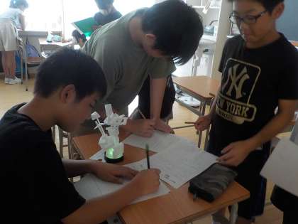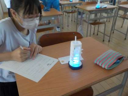 「光の形」が完成し、鑑賞をしました。教室を暗くして、ライトをつけてみると、とっても綺麗でした。友達の作品のよさをたくさん見つけました。