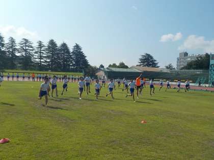 五福陸上競技場で、外部指導者の方々から走り幅跳びや50m走のコツを教えていただきました。