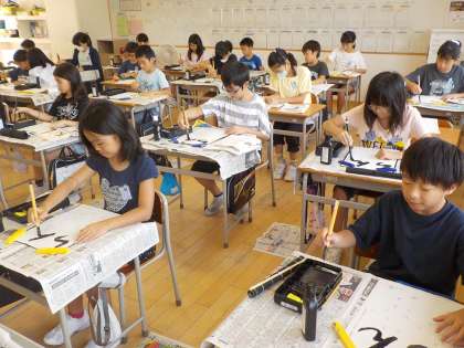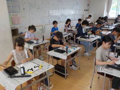 毛筆にチャレンジしました。折れのときの筆の使い方に気を付けて、「らん」と書きました。