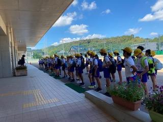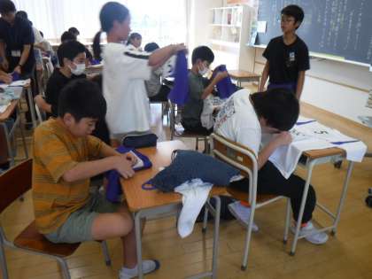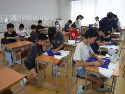6年生は、今日チャレンジ陸上記録会があります。事前にゼッケンを体育服の上とズボンに安全ピンで留めて付けます。暑い天気になりましたが、元気に出発します。