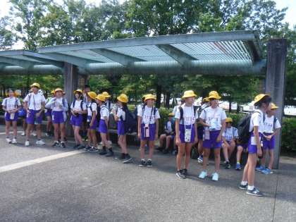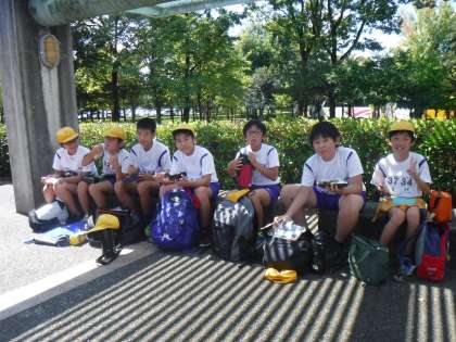 バスに乗って陸上競技場まで行きました。午前中の人がまだ競技中なので、日陰で早めの昼食をとります。