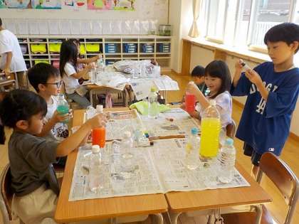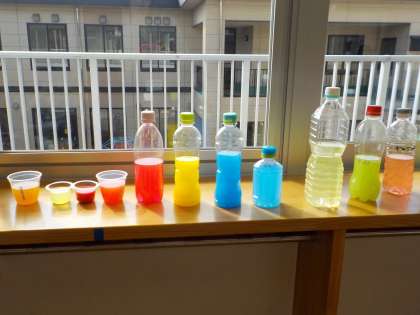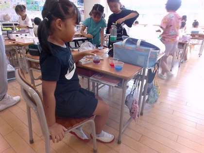 図画工作科「カラフルいろみずであそぼう」の学習では、水に絵の具を混ぜて色水を作って遊びました。2種類の色水を混ぜたり、光に当てたりして楽しみました。