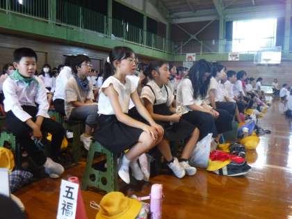 体育館で他の学校の合唱や合奏を真剣に聴いています。