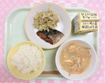 【献立】 ・ごはん ・牛乳 ・ふくらぎの照焼き ・野菜のピリ辛炒め ・五目みそ汁