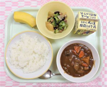 【献立】 ・ごはん ・牛乳 ・たべキリンハヤシ ・ビーンズサラダ ・バナナ
