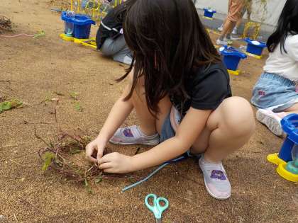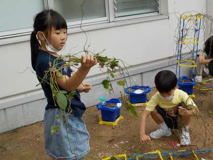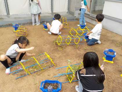 これまで大切に育ててきたあさがおのつるを使ってリース作りをしました。絡まったつるを支柱から外すのに苦戦していましたが、一つ一つ丁寧に作業することができました。今後、飾り付けをして仕上げていきます。