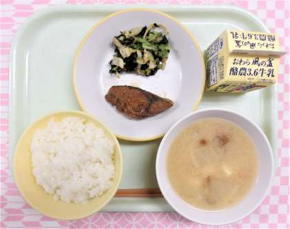 【献立】 ・ごはん ・牛乳 ・揚げ魚のレモン味 ・磯和え ・なめこ汁