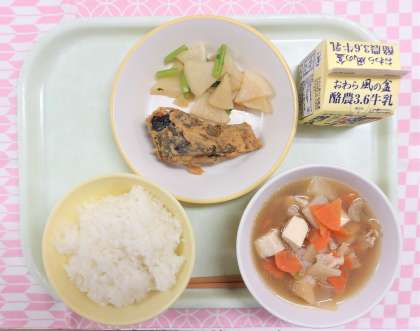 【献立】 ・ごはん ・牛乳 ・魚のえごま揚げ ・かぶのいろどり ・根菜汁