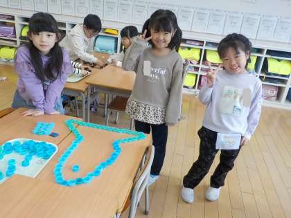 たくさんのペットボトルキャップを使って、どんなことができるかを考えて、みんなで遊びました。同じ色を集めたり、並べたり、積み上げたりして様々なものを作りました。