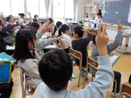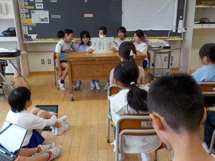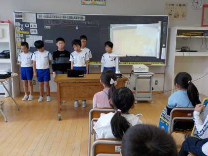 総合の学習で学んだことを、3年生に発表しました。紙芝居やクイズ、ペープサート、スライド等それぞれが伝えたい手段を選び、3年生に分かりやすく発表しようと練習に励んできました。今日は、それを発表し、3年生から「家族団欒に取り組んでみようと思った」「二酸化炭素を減らせるように頑張りたい」などの感想をもらいました。4年生の子供たちからも「3年生に伝える学習は楽しかったしやりがいがあった」と、満足げな様子が見られました。