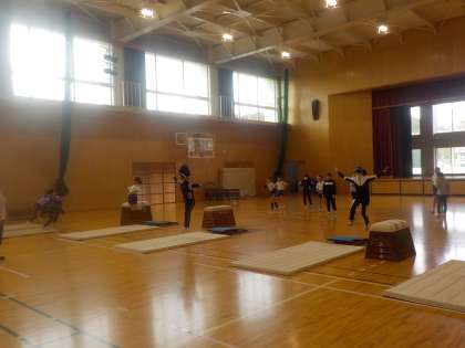 富山市スポーツ協会の方に跳び箱を指導していただきました。跳び箱の上に両足で乗る練習や、手を跳び箱の奥の方に着けることなどを教えていただき、一生懸命取り組みました。