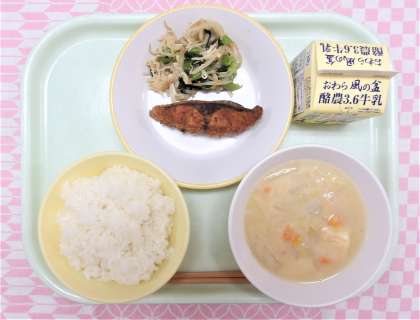 【献立】 ・ごはん ・牛乳 ・魚の香り揚げ ・しょうがひたし ・呉汁