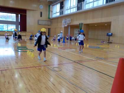 最近の体育は、ラダー・大縄8の字跳び・走る運動に取り組んでいます。走る運動では、コーンやフラフープ、ロープ等の障害物を並べたコースでリレーをしています。速く走れるコースになるように、色団の友達と相談しながら並べ方を工夫しています。