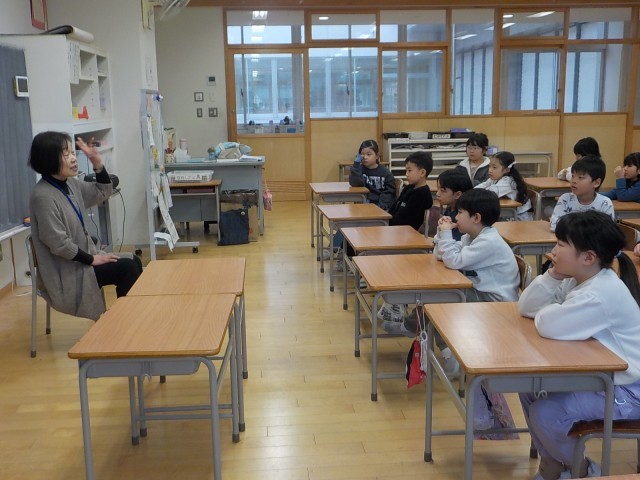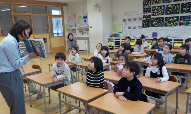 富山市立図書館の方が来てくださり、「まちどおしい はる」をテーマに、いろいろな本を紹介してくださいました。春を感じられる本がたくさんあり、興味津々の子供たちでした。