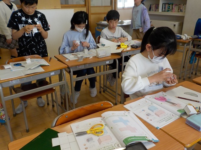 今日は、直方体と立方体を作り、どちらのかさが大きいかを予想しました。