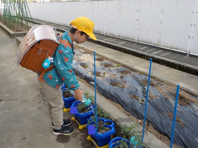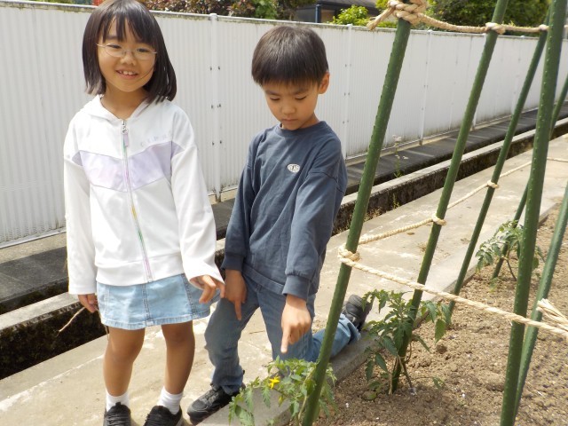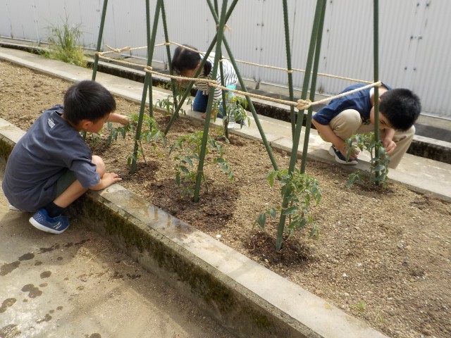 2年生の生活科では、野菜を育てています。毎日水やりをがんばっています。また、自分たちにできることを本で調べて、肥料をやったり、支柱を立てたりしました。