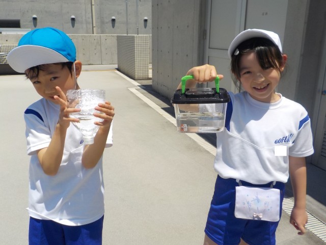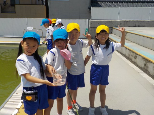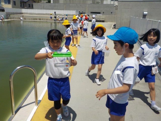 2年生の生活科「生きものと友だち」では、プールにいる生きものを探しに行きました。