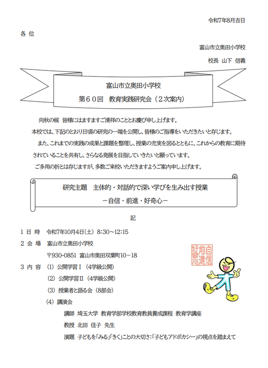 10月4日(土)に行います「第60回教育実践研究会(2次案内)」を掲載しました。「主体的・対話的で深い学びを生み出す授業ー自信・前進・好奇心ー」を研究主題とし、日頃の研究の一端を公開いたします。