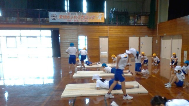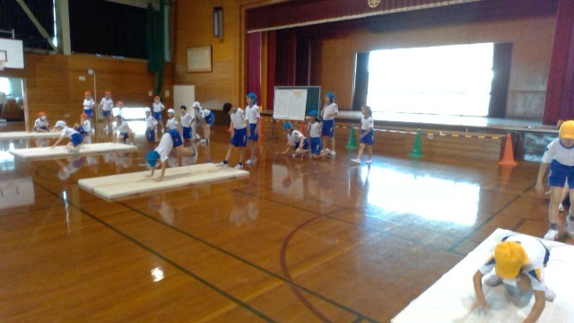 体育科の学習では、マット運動に取り組んでいます。今日はワニ歩きやうさぎ跳び等をし、基礎となる体の動かし方や感覚を身に付けました。