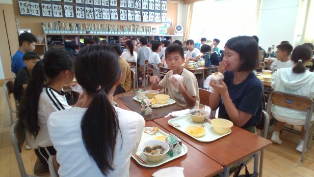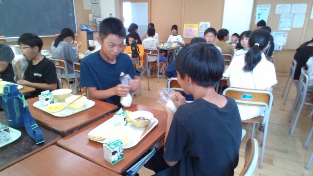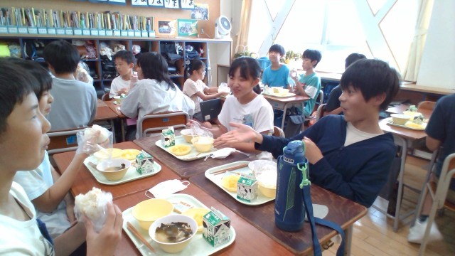 今日の給食は、防災献立でした。実際にセルフおにぎりを作って「袋の中でふりかけを混ぜるのが難しい」「おかずが少ない分、味の付いたごはんがたくさん食べたくなる」「いつもより調理が楽なものばかりだから、自分でもできそう」等のやりとりを交わしていました。