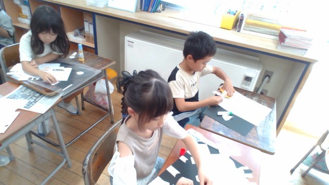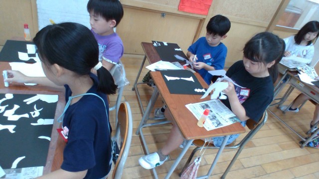 図画工作科の「はさみであーと」の学習では、画用紙を自由に切ってできた形から想像を広げて作品づくりを行っています。