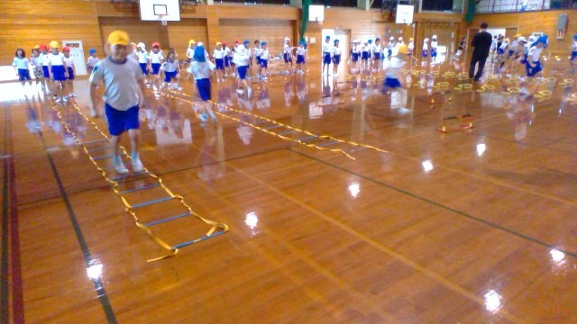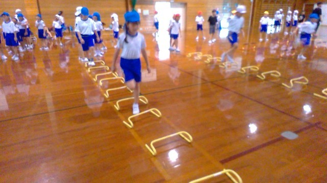 体育科の学習では、走る運動として、ミニハードルを使い、歩幅や低く跳ぶことを意識して取り組みました。
