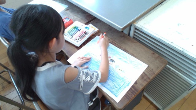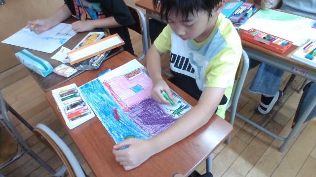 図画工作科では、「あの日あの時の気もち」の学習をしています。夏休みの思い出について、気持ちが伝わるように表し方を工夫する姿が見られました。