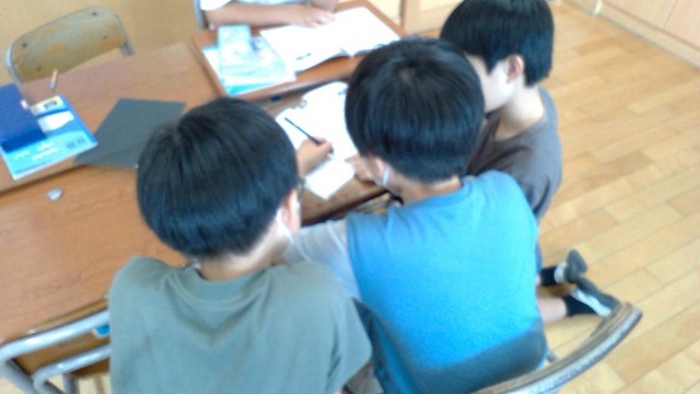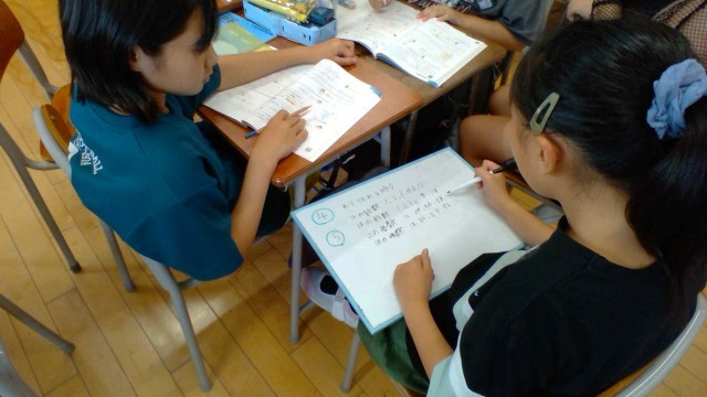 算数科の学習では「整数の性質を調べよう」の学習をしています。グループの仲間との聴き合いを通して「約数」「公約数」の意味を考えていました。