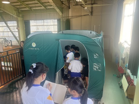 今日の社会科では、災害時に使用される防災テントを実際にたててみました。子供たちは、実際に中に入り、考えていたよりも人が入れないことを知り、災害が起きたとき自分にできることを真剣に考えていました。
