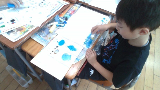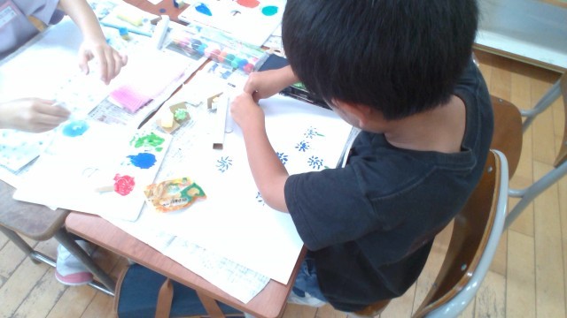 図画工作科では、「これでかきたい」の学習をしています。スポンジや綿などを使って、模様から表したいものを考えています。