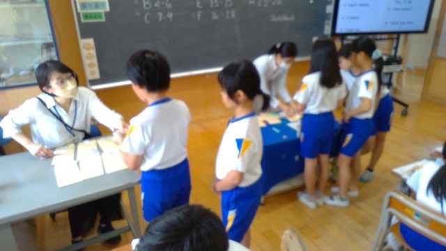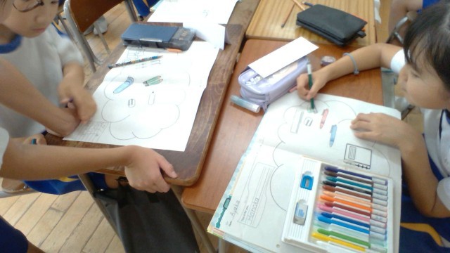 外国語活動では、欲しい文房具を英語で伝え、お気に入りの文房具セットを作りました。