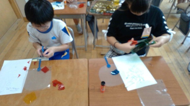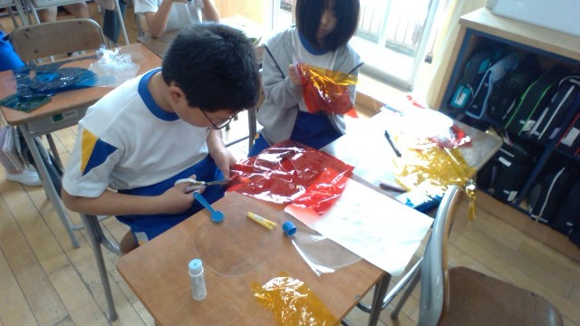 図画工作科の「光のさしこむ絵」の学習では、光を通した形や色の組み合わせを工夫しました。