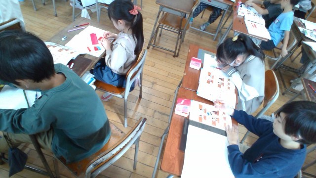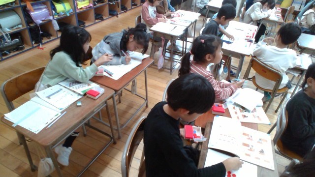 算数科の「かけ算」の学習では、問題文を読み、おはじきを使いながらかけ算の立式に挑戦しています。
