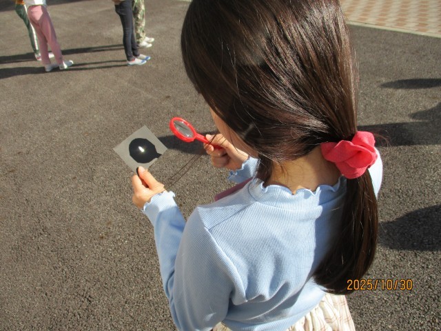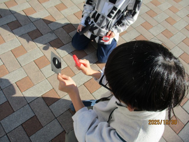 理科では「太陽の光」の学習をしています。今日は、虫眼鏡を使って光を集めました。