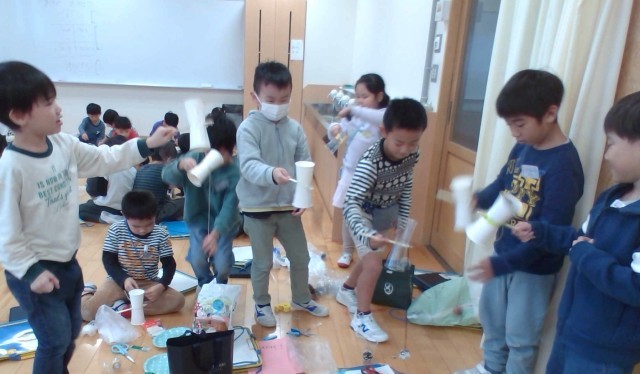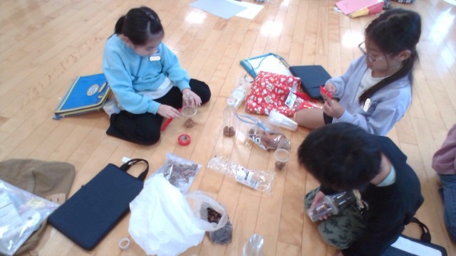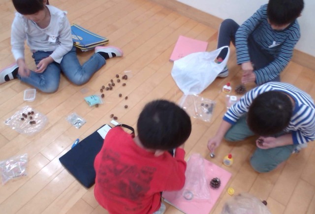 生活科「あきで あそぼう」の学習では、どんぐりやまつぼっくりを使って、おもちゃづくりに取り組みました。どんぐりの個数を変えてマラカスの音を変えたり、持ってきた材料の長さや形を工夫して回りやすいこまを作ったりする姿が見られました。