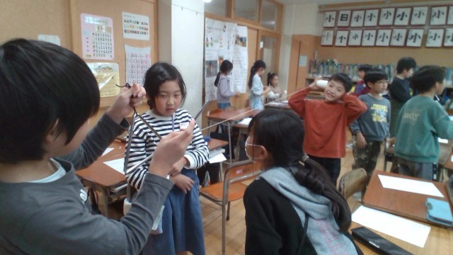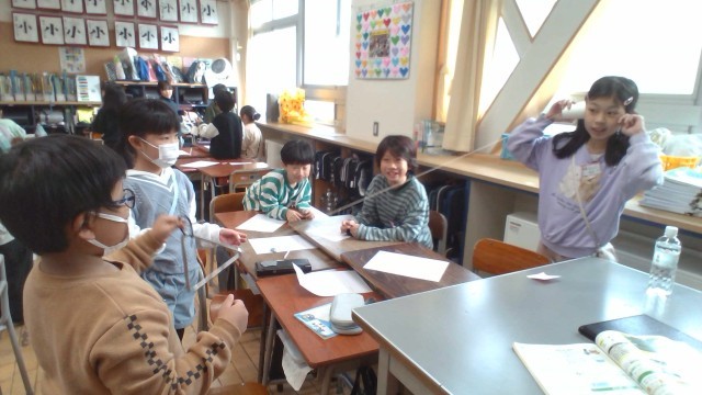 理科では、「音のせいしつ」の学習をしています。今日は、音を伝えている物はふるえているのか実験をして確かめました。