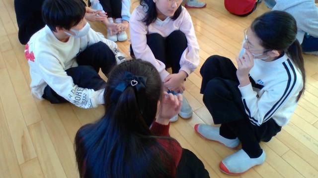 総合的な学習の時間では「卒業お祝いプロジェクト」のスローガン作成に向け、動き始めています。思いが詰まったスローガンにするためにどうしたらよいかについて聴き合い、スローガンに入れたい言葉を考えました。