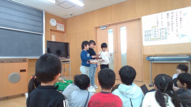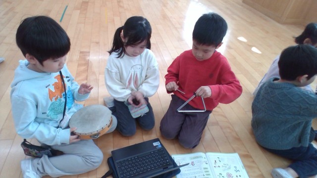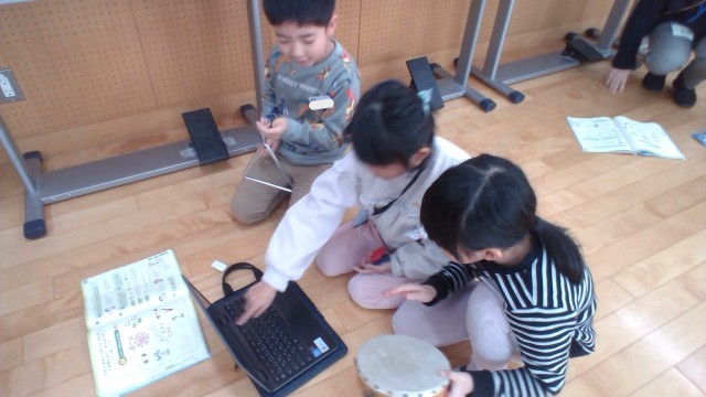 音楽科「えからうまれたおんがく」の学習では、絵から思い浮かべた音を組み合わせて、音楽をつくりました。