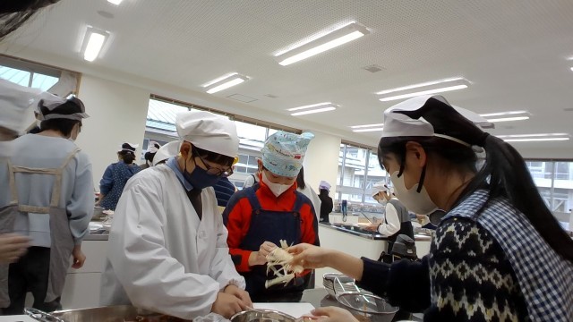 調理実習を行いました。野菜の種類によって切り方やゆで具合を工夫して野菜のベーコン巻きを作りました。写真は1組の様子です。