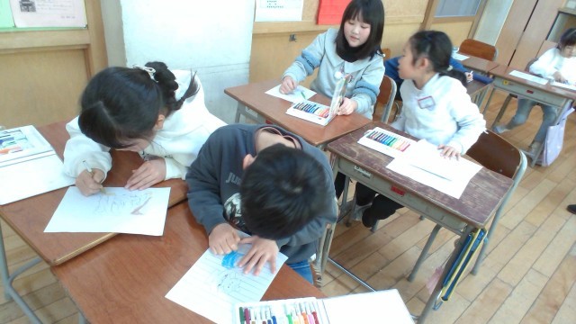今日は「ぬり絵がかり」が企画した塗り絵イベントを行いました。友達が描いたイラストに、ていねいに色を塗りました。