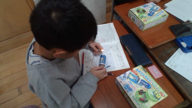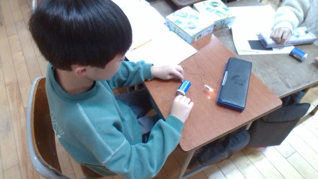 理科では、「電気の通り道」の学習をしています。乾電池と豆電球をどのようにつなぐと明かりがつくのか予想を立て、実験しました。