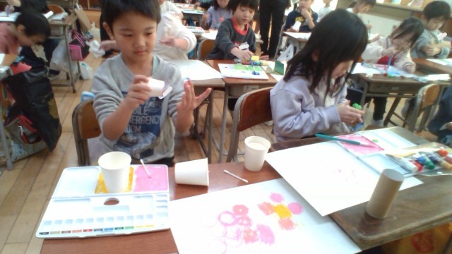 図画工作科「うつしたかたちから」の学習では、色や写す材料を考え、形が並べて広がる世界を楽しみました。