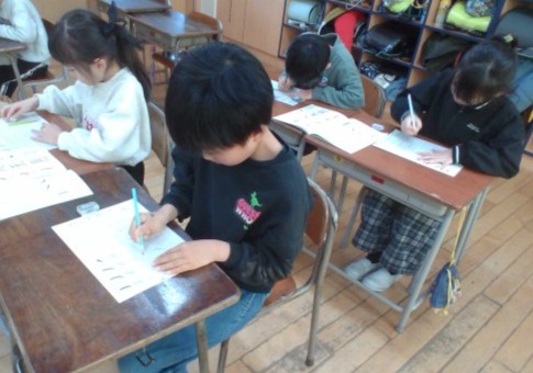 書写の学習では、正しい字の形を意識して学習を行っています。今日は様々な「左はらい」の方向に気を付けて漢字を書きました。