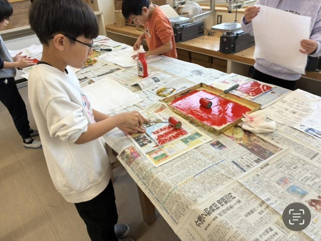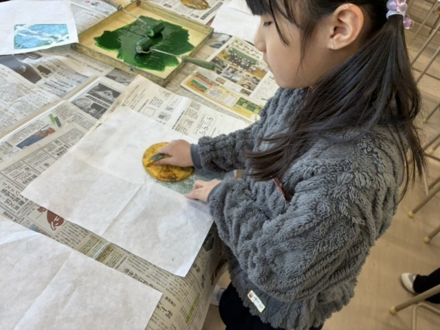図画工作科では、版画の学習をしています。今日は、インクを付けて刷りました。