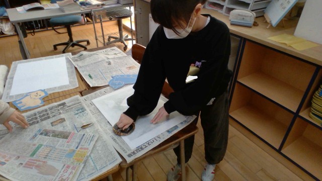 図画工作科では、版画に挑戦しています。今日はインクを塗り、刷り紙をかぶせて刷りました。色がしっかり移るよう丁寧に進めました。