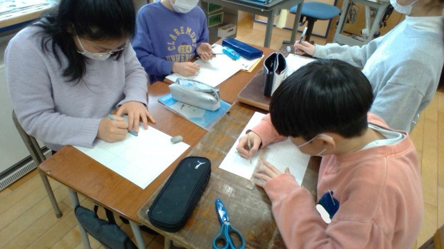 算数科の学習では、三角柱の展開図を書きました。三角柱を切り開いた様子をイメージしながら取り組みました。