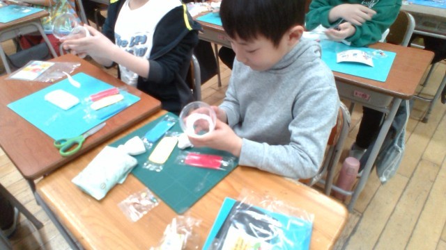 図画工作科では、「空きようきのへんしん」の学習をしています。プラスチックコップと粘土を使って、生活で使えるものを作っています。