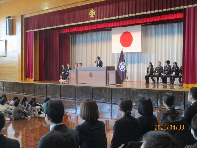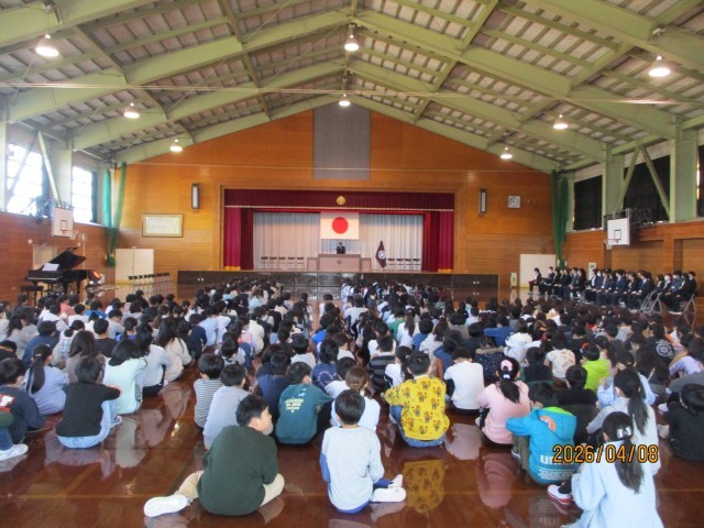 校庭の桜の花びらが舞う中、着任式と始業式を行いました。